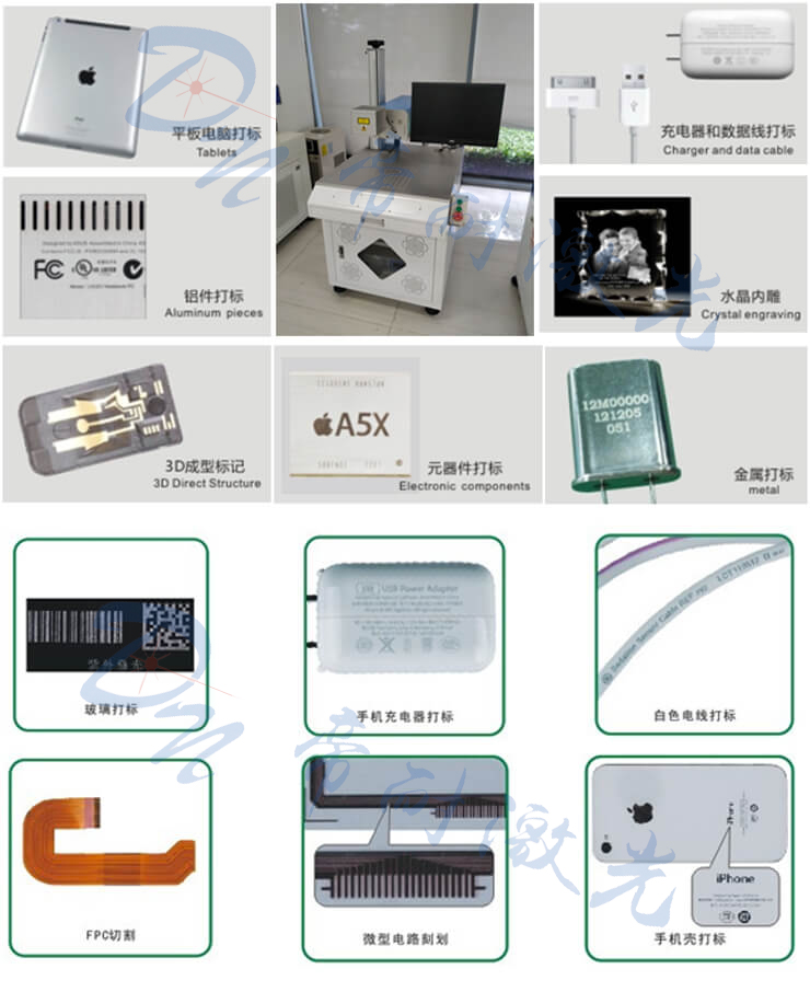 廣泛應(yīng)用于LCD液晶玻璃,LED基片,藍寶石基片,半導(dǎo)體晶圓,F(xiàn)PC柔性電路板,消費類電子產(chǎn)品,手機部件,陶瓷等的二維碼以及數(shù)字字母精細打標(biāo),ITO刻膜等行業(yè)。
