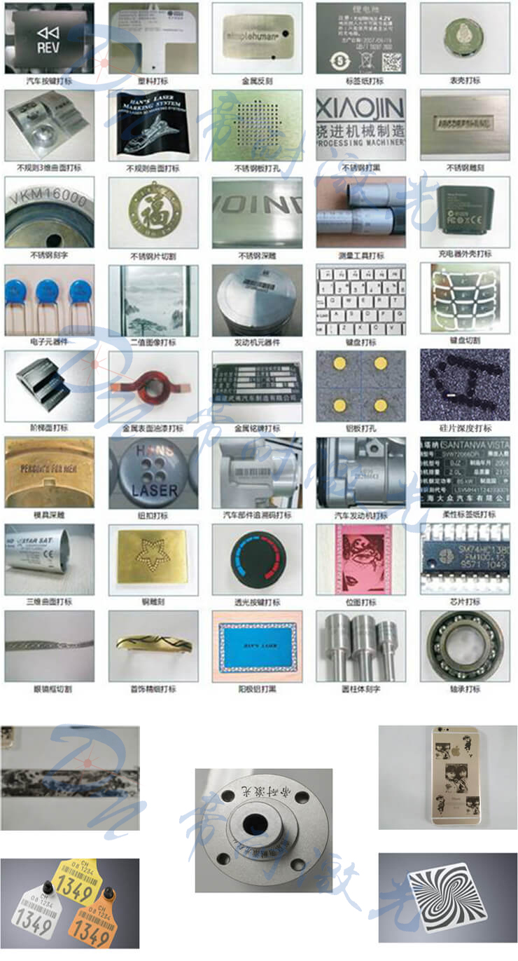 廣泛適用于集成電路芯片、電腦配件、工業(yè)軸承、鐘表、電子及通訊產(chǎn)品、航天航空器件、各種汽車零部件、家電、五金工具、模具、電線電纜、食品包裝、首飾、煙草以及軍工產(chǎn)品等眾多領(lǐng)域圖形和文字的標記,以及大批量生產(chǎn)線作業(yè)。